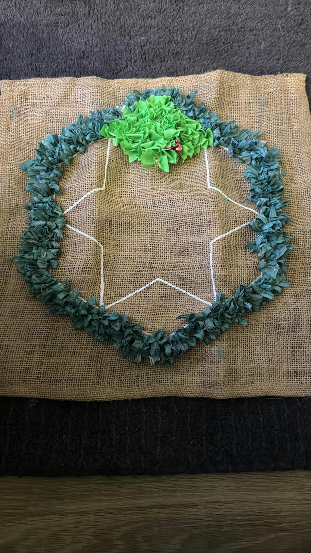 It doesn’t matter at all. You can start wherever you like, as long as you stay within the white printed hexagon line (not the stitched hemmed edge). See exactly which parts of the hessian should be rag rugged on the Community Rug page here.